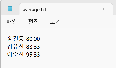 04. 다음과 같이 학생들의 교과목 성적이 저장되어 있는 텍스트 파일을 읽어서 성적의 평균을 구하여 다른 파일에 쓰는프로그램을 작성해보자. 평균은소수점 2자리 까지 출력하도록 하라.