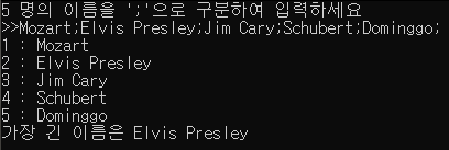 08. 한 라인에 ';' 으로 5개의 이름을 구분하여 입력받아, 각 이름을 끊어내어 화면에 출력하고 가장 긴 이름을 판별하라.