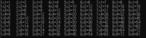 cout << j << 'x' << i << '=' << i * j << '\t';