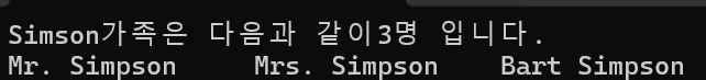 cout << name << "가족은 다음과 같이" << size << "명 입니다." << endl;