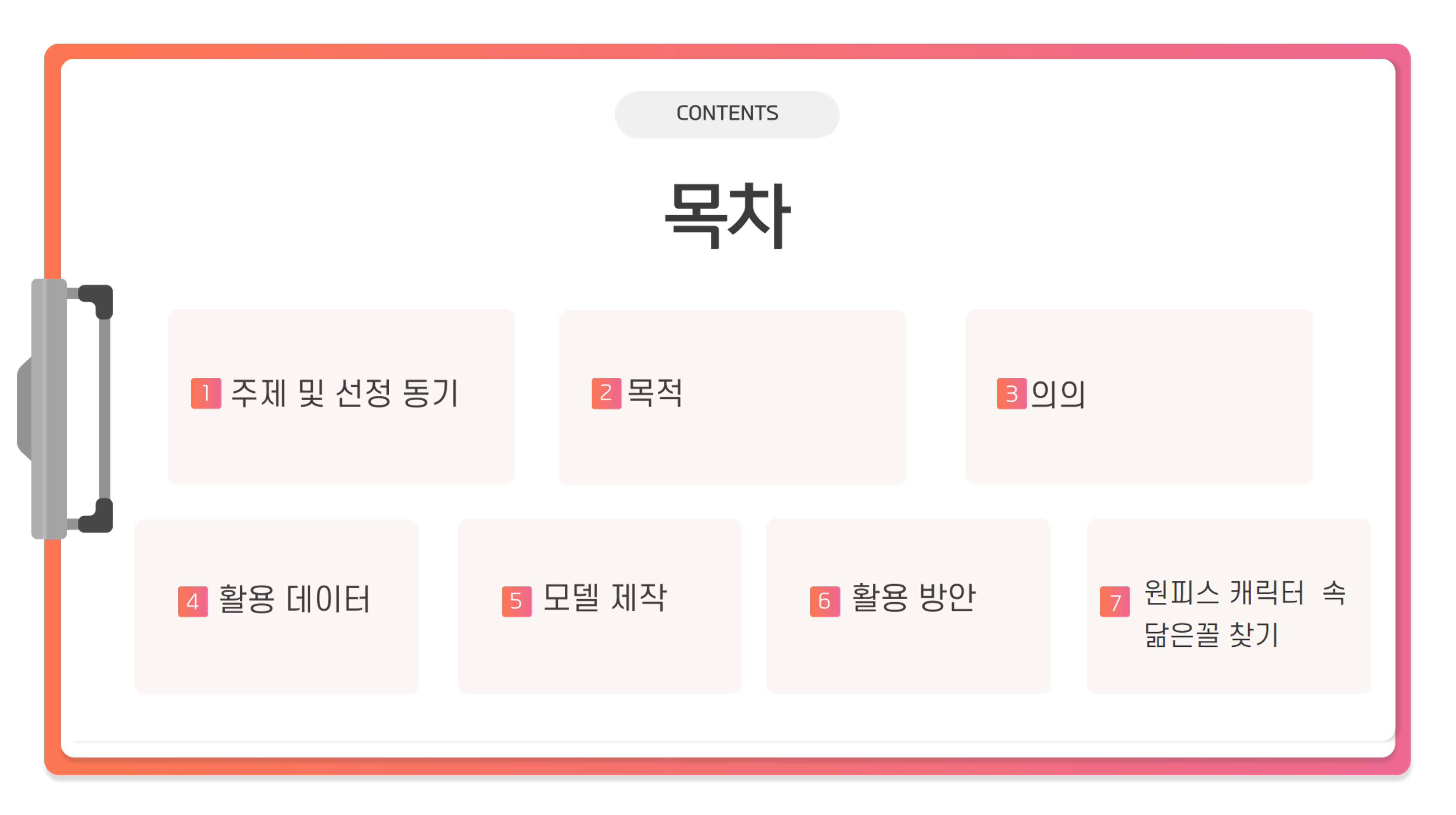 24년도 1학년, 여름에 진행했던 프로젝트입니다. 노코딩 방식인 Orange3를 활용하여 TikTok에서 처럼 실제 사람과 닮은 원피스 속애니메이션 캐릭터 찾기 머신러닝을 제작하였습니다.